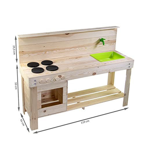Die niedrige Arbeitshöhe der Matschküche ist mit ca. 59 cm optimal für leer Kinder ab 3 Jahren brauchbar.