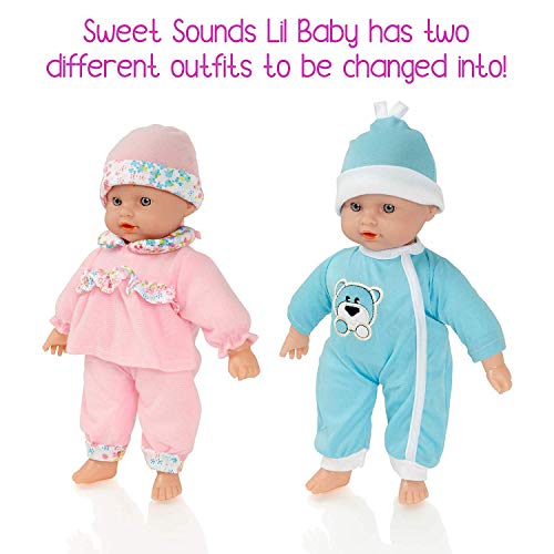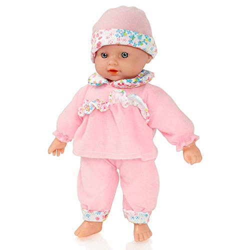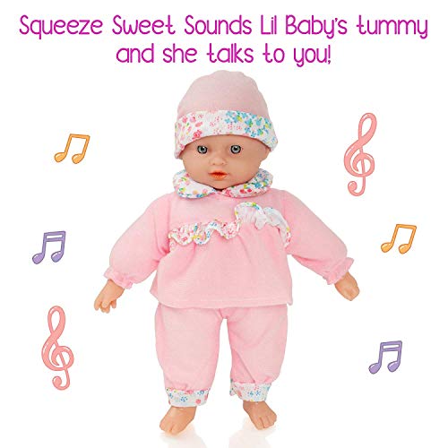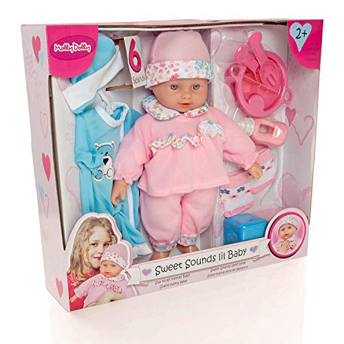 Süße Töne Lil ‚Baby von Molly Dolly ist eine entzückende 30-cm-Babypuppe mit weichem Körper, die 6 entzückende Babywörter und -töne spricht. Drücken Sie auf ihren Unterleib, um sie lachen und weinen zu hören oder qua „Mama“ oder „tschüss tschüss“ zu sprechen.