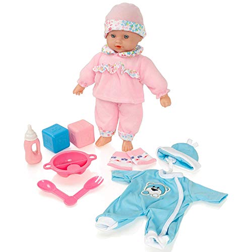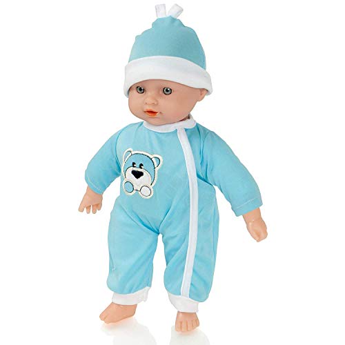 Sweet Sounds Lil ‚Baby von Molly Dolly ist das ideale erste Puppen- und Zubehörset. Sie hat einen ultra weichen und kuscheligen Körper und weiche Vinyl-Eigenschaften. Drücken Sie auf ihren Unterleib, um einen von 6 Lauten oder Wörtern zu hören. Mit einer Größe von 30 cm ist sie die perfekte Größe für jeden Puppenwagen oder jedes Bett. Sie trägt einen superweichen rosa-weißen Teddy-Strampler mit passender Motorhaube, im Kontrast dazu vulgo ein isoliert blaues Teddy-Outfit. Ihre Kleidung kann zum Geschirr spülen leicht entfernt werden.