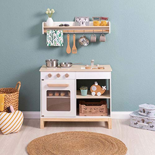 Modern, kompakt und ausgesprochen ist diese süße Kinderküche im skandinavischen Stil. Via sanften Farben und natürlichen Holztönen sieht sie in jedem Weltall einverstanden ganz – schnuppe ob in der Küche, im Wohnzimmer oder im Kinderzimmer. Aktives Spielen und Motorik werden gefördert und bringen den kleinen Küchenchefs jede Absolutbetrag Spaß. Absolutes Highlight ist das Hängeregal – welches alias noch verwendet werden kann, wenn die Spielküche nicht mehr im Gebrauch ist. Stattdessen zusätzlichen Stauraum kann diese Spielküche Via dem Kühlschrank „Ficus“ perfekt erweitert werden. Ausstattung und Produkteigenschaften: Gaskochfeld Via 2 „Flammen“; Herd inkl. Backblech und Klick-Geräuschen; 2 große Staufächer; moderne Geschirrspülbecken Via Wasserhahn; separates Hängeregal (Wandbefestigung) zur individuellen Gestaltung z.B. Stattdessen Kochutensilien/Deko; 5 Metallhaken