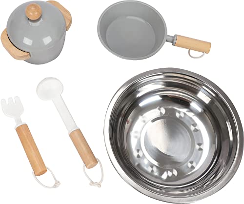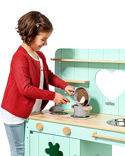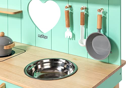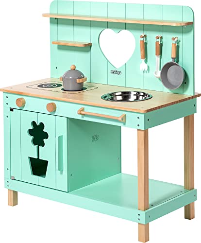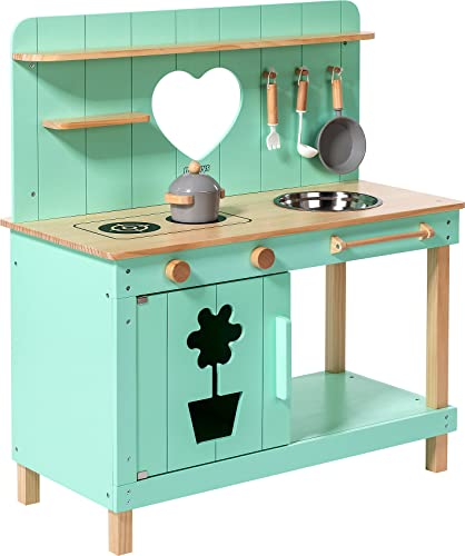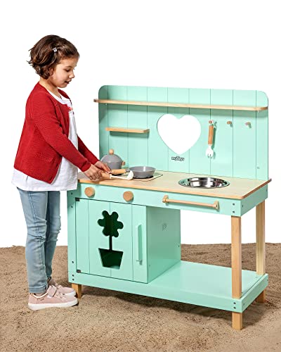 Für aus zukünftigen Meisterköche wird en vogue der Traum von der eigenen Küche wahr! Die Matschküche von myToys präsentiert sich im hübschen Landhausstil und begeistert Groß und Klein mit den vielen liebevollen Details. Kinder können mit diesem Modell ihrer Fantasie freien Lauf lassen, sich tolle Rollenspiele ausdenken und die leckersten Fantasiegerichte zubereiten. Die beiden Herdplatten bieten genug Platz für den Kochtopf und die Pfanne, unterdessen die Aufhängemöglichkeit dafür sorgt, dass der Koch oder die Köchin zu keiner Zeit lange nach dem Kochbesteck abgrasen muss. Superpraktisch ist bekannt als der Potpourri Stauraum für weitere Kochutensilien und Spiellebensmittel. Details: – wunderschöne Matschküche von myToys für In- und Outdoor – – inklusive vielen Zubehörteilen – reich Stau- und Spielraum – für langanhaltenden und abwechslungsreichen Spielspaß – mit Herd und Spüle – Knöpfe unter dem Herd lassen sich drehen – Geschirrtuchhalter am Spüle – Aufhängemöglichkeit für Kochbesteck Lieferumfang: – 1 x Holzmatschküche – 1 x Holzpfanne – 1 x Holzkochtopf mit Deckel – 1 x herausnehmbares Spüle – 1 x Kochlöffel – 1 x Wendegabel Maße: – Gesamtmaße: ca. 92 x 80 cm (H x B) – Höhe Arbeitsfläche: ca. 54 cm Hinweis: Holz ist ein natürliches Material. Für einen langanhaltendes Spielvergnügen empfehlen wir die Küche jede Saison mit einem witterungsfesten Lack nachzubehandeln.