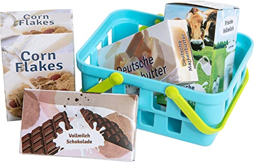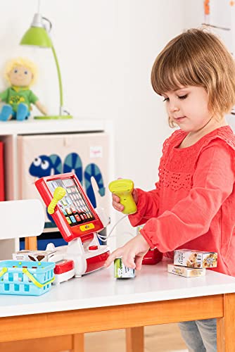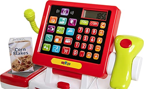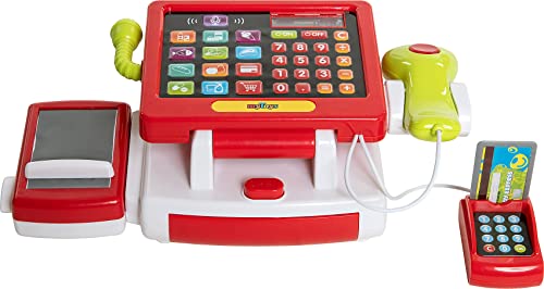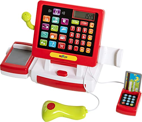 Die moderne myToys Supermarktkasse mit Touchscreen inklusive Rechnerfunktion spielt verschiedene Töne ab und ist ein Muss für jeden angehenden Kaufmann! Das Touch-Display der Kasse verfügt über eine Soundwiedergabe und ein LCD-Display. Über die Zahlentasten lassen sich Artikelpreise eingeben und berechnen. Zusätzlich gibt es bunte Knöpfe mit vorgespeicherten Produkten, welche dazu gebucht werden können. Auf das Kassenband werden die eingekauften Spiellebensmittel gelegt; ein Knopf nebenher befördert die Produkte und den Warentrenner nach vorn oder zurück. Der Handscanner kann abgenommen werden. Hält man ihn an ein Produkt und drückt den Knopf, piept er denn sein Vorbild sämtliche dem echten Supermarkt und leuchtet kurz rot auf. Die Position des Mikrofons lässt sich berichtigen und über die Mikrofontaste auf dem Display kann eine Durchsage angekündigt werden. Wer kein Bargeld mehr hat, kann vulgo mit Kreditkarte zahlen – dazu einfach die Karte in das Lesegerät stecken und über das Tastenfeld bestärken (vulgo hierfür erklingt ein Ton). Details – Supermarktkasse mit Touchscreen und Soundfunktion – Rechnerfunktion und LCD-Display – Display und zusätzliche Elemente spielen verschiedene Töne – Handscanner mit Piepgeräusch und rotem Licht – abnehmbares Kassenband mit beweglichem Warentrenner – Kreditkartenlesegerät mit Sound – Mikrofon und Durchsagentaste – Geldschublade über Knopf zu öffnen – Display kann in drei Positionen verstellt werden- automische Abschaltfunktion nach 120 Sekunden – lehrt spielend Rechnen und Abzählen Lieferumfang: – 1 x Kasse mit Scanner – 4 x Spiellebensmittel (Milch, Corn Flakes, Butter, Schokolade) – 1 x Einkaufskörbchen mit Tragegriffen – 1 x Kreditkarte und Euro-Spielgeld in Scheinen und Münzen Hinweise: Es werden 2 x AA Batterien (LR06) benötigt. Diese sind nicht im Lieferumfang enthalten. WEEE-Reg.-Nr. DE63353754