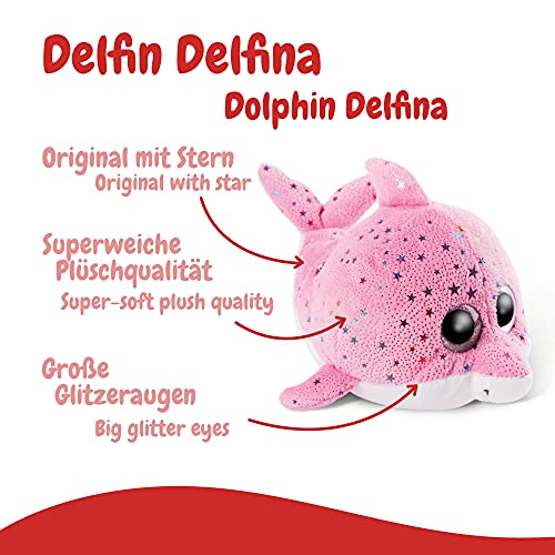 DELFINA: Das Delfin-Stofftier ist mit Glitzer-Sternen übersät & hat ein süßes weißes Bäuchlein. Die detailverliebte Finne, die Flossen & großen Glubschaugen erstellen Delfina so ausgesprochen.