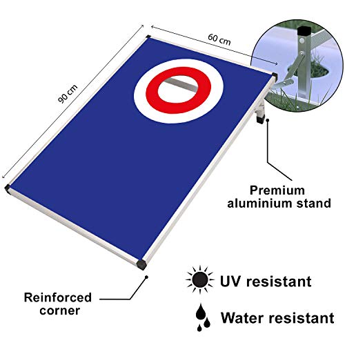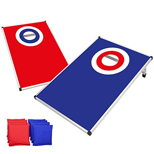 📦 🚀 GESAMTPAKET: Dieses offizielle Cornhole Set enthält 2 Aluminiumbretter mit ausklappbaren Beinen sowie 8 rote und blaue Stoffsäcke. Leicht und einfach zu verstreben auf Basis von seiner Schutzhülle. Ideales Spiel mit Freunden im Freien, das an Wochenenden oder im Urlaub über und über hin mitgenommen werden kann.