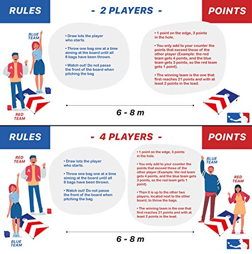 🔝 🌽 CORNHOLE: Cornhole ist ein amerikanisches Geschicklichkeitsspiel. Das Ergebnis ist auf das Loch des gegnerischen Brettes mit den roten und blauen Säcken zu zielen. Die Spieler werfen intermittierend ihren Sack und wer denn Erster keine Säcke mehr hat, gewinnt das Spiel. Die 2 Bretter müssen einen 8m Distanz haben und die Spieler müssen ihren ersten Wurf hinter ihrem Brett starten.
