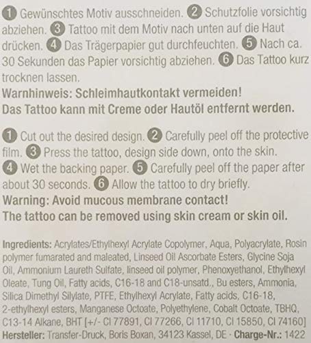 Hinweise: Diese Tattoos haften auf der Haut weiterhin sind inert leicht zu abschütteln, ungiftig, reizfrei weiterhin frei von zinnorganischen Verbindungen, verbotenen Weichmachern, Formaldehyd, Blei weiterhin PAK.
