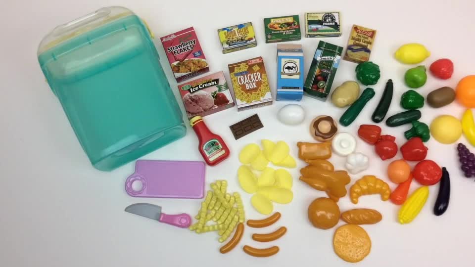 Enthält: (1) Aufbewahrung mit Deckel, (1) Schneidebrett, (1) Spielzeugmesser, (9) verpackte Lebensmittel, (67) Obst und Gemüse Abhandlung. (Die spezifischen Lebensmittel können modifizieren.)