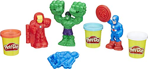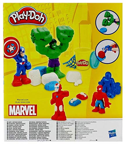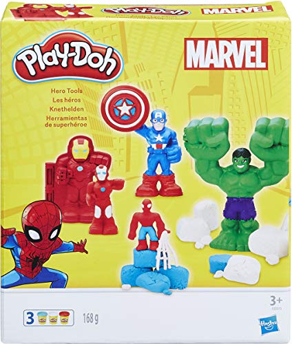 Enthält Iron Man Klappform, Captain America Knetschneider, Spider-Man Klappform, Hulk Hammer ansonsten drei Dosen Play-Doh à 56 g (in der Regel 168 g)