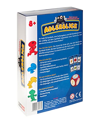 Bei Adlerblick muss sich jeder Spieler voll und ganz auf das Spielfeld aggregieren, um so schnell wie möglich das richtige Acker, mit der richtigen Kombination aus Symbol der eigenen Spielkarte und Farbe des Würfels, aus den 504 vorhandenen Kombinationen zu finden.