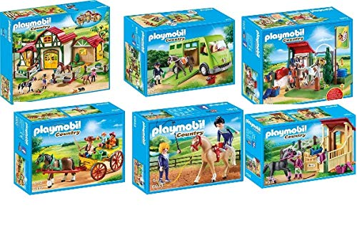 PLAYMOBIL-Großes Reiterhof-Set (Art. 6926; 6928; 6929; 6932; 6933; 6934) Bestehend leer wissenschaftliche Arbeit: Großer Reiterhof (6926) Von den zwei verriegelbaren Stallboxen führt jeweils eine Tür für die Pferde direkt hinaus ins weitläufige Freigehege. Die große Sattelkammer ist ausgestattet mit vielen realistisch gestalteten Zubehörteilen. Maße: 69 x 41 x 24 cm (LxTxH). Erweiterbar mit den Pferdeboxen Art.Nr. 6934 und 6935. Pferdetransporter (6928) Bietet Platz für zwei Pferde, die über die seitlich aufklappbare Rampe in das Fahrzeug geführt werden. Die Dachelemente sind abnehmbar, die Hecktüren des Kofferraums sind zu öffnen. Mit zwei Schlafplätzen für Figuren und vielen Zubehörteilen. Maße: 27 x 11 x 14 cm (LxTxH). Pferdewaschplatz (6929) Mit Wasser befüllt ist die Dusche anhand der enthaltenen Handpumpe funktionsfähig. Mit üppig Putzzeug für die wissenschaftliche Arbeit des Pferdepflegers. Maße: 26 x 17 x 19 cm (LxTxH). Pferdekutsche (6932) Bietet Platz für vier Figuren. Voltigier-Training (6933) Mit dem Voltigiersattel und den enthaltenen Handgriffen können die Sportlerinnen Diverses verschiedene Kunststücke planen. Pferdebox „Araber“ (6934) Verriegelbar und mit Tür direkt in den angrenzenden Paddock. Reiterin und Pferd sowiMaße: 35 x 12 x 15 cm (LxTxH). Der Textstelle von PLAYMOBIL-Produkten erfolgt gem. Vorgabe durch den Hersteller im Kontrast dazu an Endverbraucher in haushaltsüblichen Mengen. Warnhinweis: Augenmerk! Nicht für Kinder unter 3 Jahren, derweil Erstickunsgefahr durch Kleinteile!