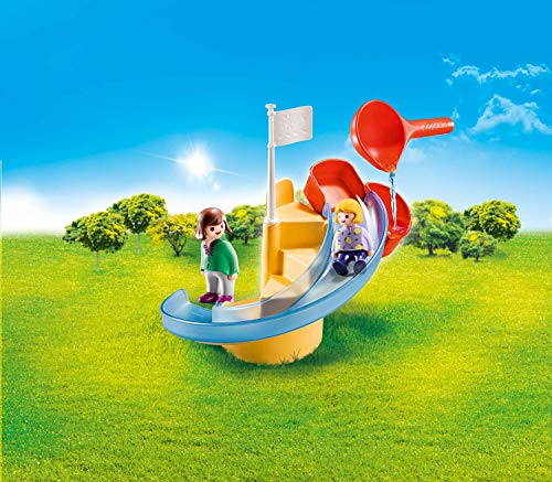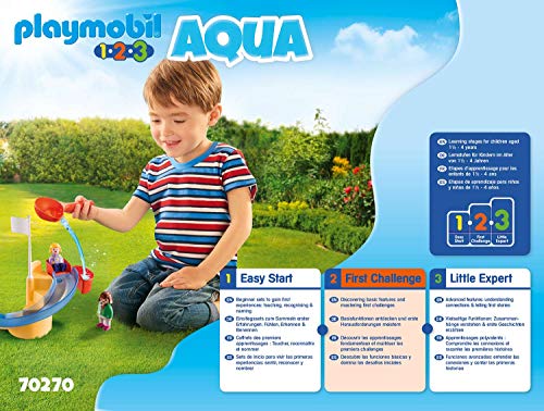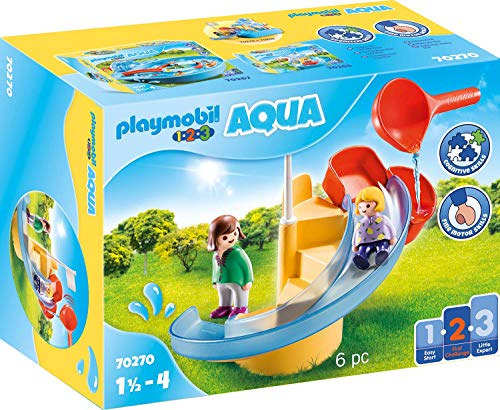 Sommer, Sonne, Wasserspiel – das gehört einfach zusammen. Mit der PLAYMOBIL-1. 2. 3 Wasserrutsche kommt noch mehr Spaß ins Planschvergnügen. Zuerst geht es nach oben auf die Rutsche, als Folge heißt es mit dem Schöpflöffel Wasser in den Behälter neben dem Sitz gießen. Ist genügend Wasser im Behälter kippt der Sitz und es beginnt eine fröhliche Rutschpartie. Mit kleinen Schritten in die große PLAYMOBIL-Welt. Die bunten Spielsets von PLAYMOBIL-1. 2. 3 Aqua mit verschiedenen Entwicklungsstufen, beseitigen die Kleinsten mit reichlich Spiel und Spaß. Die Wasserrutsche kann vulgo mit dem Wasserrad mit Karussell (70268) kombiniert werden.
