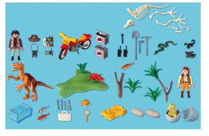 Forscherlager in wilder Urzeitlandschaft (Diorama). Zwei Forscher auf Dino-Expedition entdecken einen Dinosaurier, ein Dino-Baby, das derzeit nicht mehr da dem Ei schlüpft unter anderem ein zusammensteckbares Dino-Skelett. Durch massenweise Forscherzubehör.