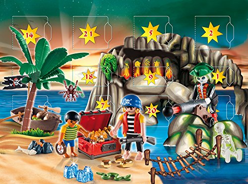 4164 Adventskalender „Piraten-Schatzhöhle“ In der Felshöhle der geheimnisvollen Insel (Diorama) verbirgt sich ein sagenumwobener Goldschatz. Ausgerüstet via schwimmendem Ruderboot und Schatzkarte erzeugen sich die beiden Piraten auf die Suche. Freilich er wird von einem fluoreszierenden Geisterpiraten via schießender Kanone bewacht…