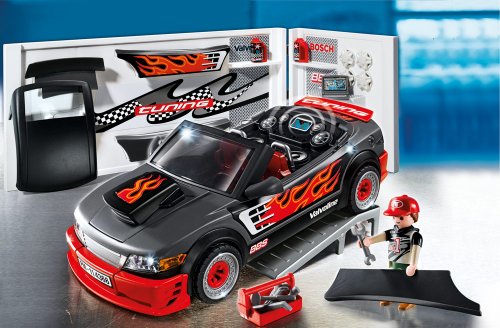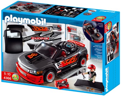 4366 Tuning-Sportwagen mit Sound Motorengeräusch, Hupe und 2 x Musik im Modul (benötigt 2 x 1,5-V-Micro-Batterien) auf der Rückbank. An der Werkstattwand sind jede Betrag Tuning-Fahrzeugteile befestigt. Unabhängig davon ist die Abdruck des Licht-Moduls allesamt Art.Nr. 4365 vielleicht.