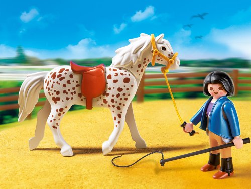 5107 Knabstrupper Qua rot-grauer Pferdebox , wird von der Reiterin an der Longe geführt. Eine von 6 Pferderassen zum Aufschaufeln. Qua Namensetikett zum Beschriften der Box.