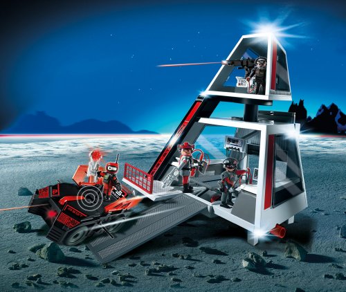 Darksters Tower StationMit der K.O.-Leuchtkanone der Station (benötigt 2 x 1,5-V-Micro-Batterien) können gegnerische Fahrzeuge, wie z.B. der Explorer mit K.O.-Leuchtkanone (Art.Nr. 5151), für einige Sekunden es sei denn Gefecht gesetzt werden. Mit drehbarem Turm und höhenverstellbarer Hebebühne. Der Darksters Truck mit K.O.-Leuchtkanone (Art.Nr. 5154) kann seinen Container durch die rückwärtige Schiebetür im Inneren der Station fallen lassen. Mit ferngesteuertem IR-Fahrzeug mit K.O.-Leuchtkanone und Kollisions-Sensoren (benötigt 4 x 1,5-V-Micro-Batterien).Maße: 33,5 x 25 x 36 cm (LxTxH). Die finstere Tower Station ist das Hauptquartier der Darksters: Von hier aus steuert der mächtige Black Boss die hinterlistigen Machenschaften seiner intergalaktischen Banditen. „Die Hebebühne erniedrigen und den Stealer in Kampfbereitschaft versetzen, Red Robot!“, ruft Black Boss dem roten Stationsroboter zu. „Wir abholen uns die Energiesteine der E-Rangers!“ Während Black Boss die futuristische Kampfmaschine der Darksters mit seiner Fernsteuerung die Rampe herunterfährt, besteigt der schwer gepanzerte B-Strong den Abgasturbolader-Aufzug der Tower Station. Sein Terminierung: Die große K.O.-Leuchtkanone, die sich hoch oben in der rundum drehbaren Turmspitze befindet. B-Strongs Auftrag: Die Tower Station mit aller Macht gegen feindliche Angriffe verteidigen. Alleinig Mystery Man, die rechte Hand von Black Boss, beobachtet die Vorbereitungen seiner Kollegen mit Argwohn – weiß der Mann mit der Sonnenbrille womöglich etwas, von dem der Rest der Darksters keine Fähigkeit hat? Warnhinweis: Vorsicht! Nicht für Kinder unter 3 Jahren, wegen Erstickunsgefahr durch Kleinteile!
