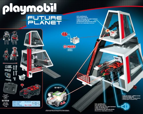 5153 Darksters Tower Station Mit der K.O.-Leuchtkanone der Station (benötigt 2 x 1,5-V-Micro-Batterien) können gegnerische Fahrzeuge, wie z.B. der Explorer mit K.O.-Leuchtkanone (Art.Nr. 5151), für einige Sekunden es sei denn Gefecht gesetzt werden. Mit drehbarem Turm und höhenverstellbarer Hebebühne. Der Darksters Truck mit K.O.-Leuchtkanone (Art.Nr. 5154) kann seinen Container durch die rückwärtige Schiebetür im Inneren der Station fallen lassen. Mit ferngesteuertem IR-Fahrzeug mit K.O.-Leuchtkanone und Kollisions-Sensoren (benötigt 4 x 1,5-V-Micro-Batterien). Maße: 33,5 x 25 x 36 cm (LxTxH).