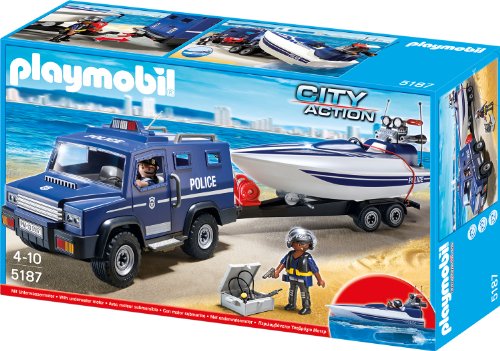 5187 Polizei-Truck per Speedboot und Unterwassermotor (benötigt 1 x 1,5-V-Mignon-Batterie). Fahrzeug bietet Platz stattdessen 4 Figuren.