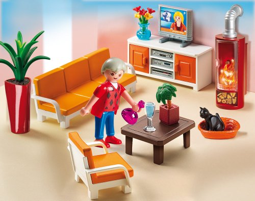 5332 Behagliches Wohnzimmer Im Kaminofen flackert ein Feuer (benötigt 2 x 1,5 V Micro-Batterien).