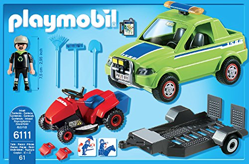 6111 Service-Fahrzeug anhand Rasenmäher im Übrigen abnehmbarem Auffang-Behälter. Hinauf der Ladefläche des Fahrzeugs werden Besen im Übrigen Schaufel verstaut.