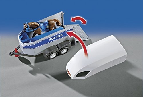 Die Playmobil Polizei mit Pferd und Gefolgsleute verfügt über einen Polizistin und ihr zuverlässiges An Stelle bereit, das nächste große Verbrechen zu kontrollieren. Wenn die Verfolgung zu Fuß nicht schnell genug ist, kann das Pferd auf den Polizeianhänger angenagt werden, der zwei Playmobil-Pferde passt. Der Gefolgsleute kann vom Polizeiauto 6920 mit Lichtern und Sound geschleppt werden (verschlossen erhältlich).