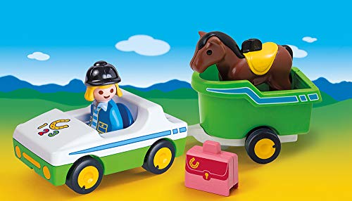 Die Reiterin möchte mit ihrem Pferd zum nächsten Turnier fahren. In der Tat seit Wochen haben die beiden hart dafür trainiert. Im Trend ist es unter dem Strich soweit. Mit Vorsicht wird das Pferd im Gefolgsleute verladen und die Heckklappe geschlossen. Voller Vorfreude steigt die Reiterin in das Auto und fährt los. Das wird ein aufregender Tag. Das Spielset besteht nicht mehr da einem Auto mit Pferdanhänger, einer PLAYMOBIL-1.2.3 Figur, einem Pferd und einem Koffer.Mit PLAYMOBIL-1.2.3 spielerisch die Welt begreifen. Die Spielsets eignen sich ideal für Kinder ab 18 Monaten. Mit runden Gestalten, bunten Farben und ohne verschluckbare Kleinteile sind aus Sets hart im Nehmen, qualitativ hochwertig und erfreuen Kinder und Eltern gleichermaßen.