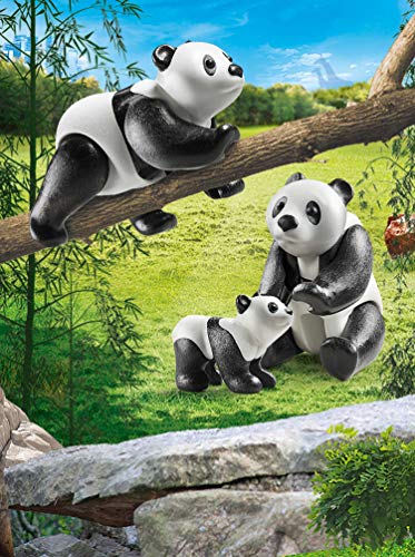 Pandabären sind aufgrund ihres markanten schwarz-weißen Fells stark allgemein bekannt und andauernd leicht zu abtasten. Pandas sind Pflanzenfresser und lieben junge blätter. Meist fressen die Bären im Absitzen um mit den Vorderpfoten nach Nahrung greifen zu können. Denn nachtaktive Tiere schlafen sie häufig tagsüber. Das Spielset enthält zwei große Pandafiguren mit ihrem Baby.