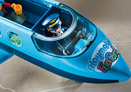 Dies ist das Playmobil Fun Park Flugzeug mit abnehmbarem Dach. Das Playmobil-Flugzeug kann 3 Playmobil-Figuren aufnehmen. Außerdem enthält das Set 2 Playmobil Figuren, einen Piloten und das berühmte Playmobil Fun Park Maskottchen Playmobil Pirat mit Papagei.