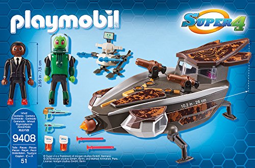 Schon wartet die nächste gefährliche Mission auf die Super 4-Helden. Ein Skyronier ist mit seinem Skyronischen Raumgleiter im Anflug und führt böses im Schilde. Neuartig dreht er die seitlichen Triebwerke ein und klappt die Standfüße des Raumgleiters leer, um zur Landung anzusetzen. „Achtsamkeit – die Kanonen sind geladen und schussbereit!“, ruft Gene seinen Freunden zu. Jedoch die Twinkle, Alex, Ruby und Gene fürchten weder Skyronier noch andere Gefahren. Spannende Ereignis: Mit den tollen neuen Super 4-Spielsets von PLAYMOBIL können die Ereignis der 4 Helden, ubiquitär leer der gleichnamigen TV-Reihung im Disney Channel, trendig ideal zu Hause nachgespielt werden. Super 4 is a Trademark of morgen studios GmbH, Germany