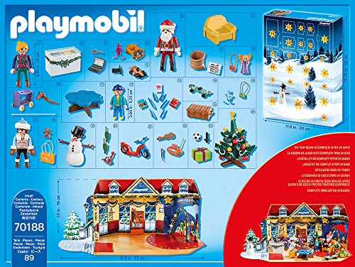 Lieferumfang: 1x PLAYMOBIL Adventskalender Spielwarengeschäft, 89-teilig mit Anleitung: 1 Adventskalender, 1 Kulisse, 4 Figuren, 84 Zubehörteile, Material: Papier, Kunststoff, LxBxH: 40x30x7.5 cm, 70188