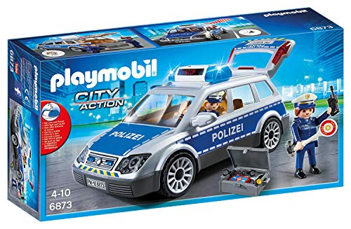 Lieferumfang: 1x Playmobil City Action Polizeiwagen, 35-teiliges Spielfiguren-Set via Formel: 1 Polizeiwagen, 2 Figuren, 32 Zubehörteile (wird ohne 1 x 1,5-V-Micro-Batterie geliefert), Material: Kunststoff, LxBxH: 24,5x13x10,5 cm, Art.-Nr. 6873