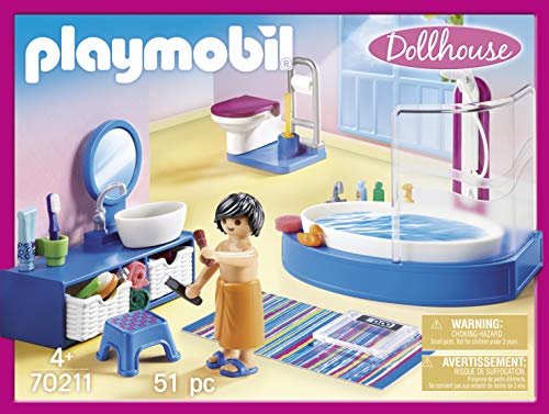 Lieferumfang: 1x PLAYMOBIL Dollhouse Badezimmer, 51-teiliges Spielfiguren-Set mit Anleitung: 1 Duschbadewanne, 1 Schrank, 1 Abtritt, 1 Figur, 47 Zubehörteile, Material: Kunststoff, Angepasst aufstellbar, LxTxH Duschbadewanne: 11x7x9,5 cm, Gewicht: 128 g, 70211