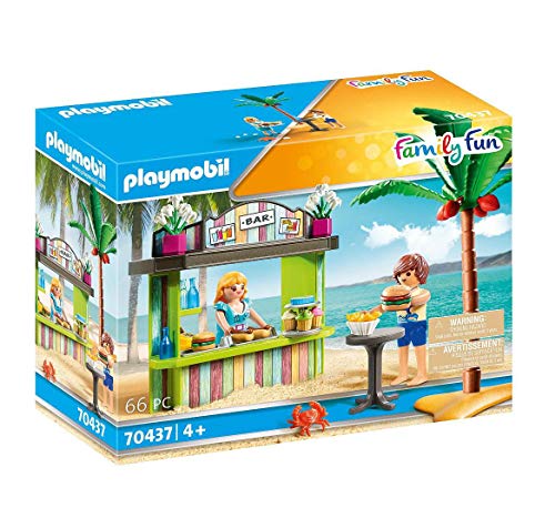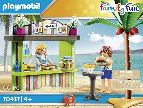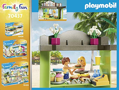 Lieferumfang: 1x PLAYMOBIL Family Fun Strandkiosk, 66-teiliges Spielfiguren-Set mit Anleitung: 1 Stand, 1 Tisch, 2 Figuren, 62 Zubehörteile, Material: Kunststoff, LxTxH: 13,5x8x13 cm, Gewicht: ca. 187 g, 70437