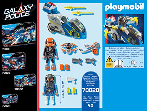 Lieferumfang: 1x PLAYMOBIL Galaxy Police-Bike, 40-teiliges Spielfiguren-Set mit Anleitung: 1 Bike, 1 Drohne, 2 Figuren, 36 Zubehörteile, 3x Knopfzelle 1,5V LR41 / Kerl 392 enthalten, Material: Kunststoff, LxTxH Bike: 15×7-10,5×8 cm, Gewicht: ca. 137 g, 70020