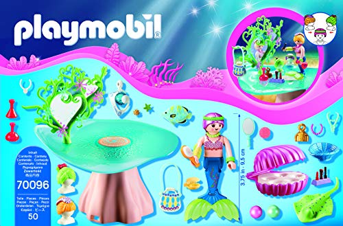 In ihrem magischen Unterwasser-Beautysalon macht sich die Meerjungfrau zurecht. Welche Frisur soll es werden und welcher Haarschmuck passt dazu? Lange probiert die Nixe verschiedene Varianten vor dem Spiegel nicht mehr da und entscheidet sich letzten Endes statt die silberne Kette. Fortschrittlich noch schnell die Tasche anlegen und dadurch kann es losgehen. Sie ist im Korallenpavillon zu einem Ball eingeladen und darf sich nicht verspäten. Das Spielset enthält eine Meerjungfrauenfigur, einen Korallenspiegel mit Blüten, einen Fisch, einen Rochen, Haarteile, Schmuck und allerlei Auswahlmöglichkeit Beautyaccessoires. In der großen Muschel können fünf Leuchtperlen aufbewahrt werden.
