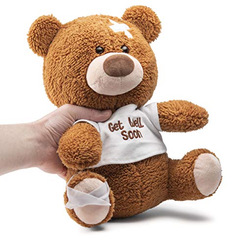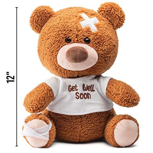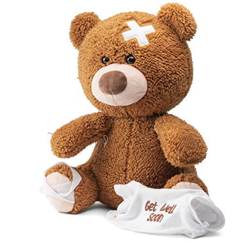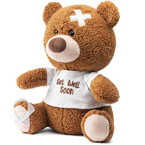 Der Bär misst 30 cm vom Kopf bis zu den Zehen. T-shirt durch Buchstaben „Get Well Soon“ (Baldige Genesung)