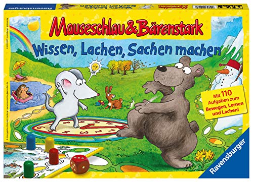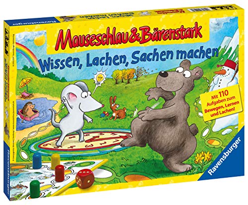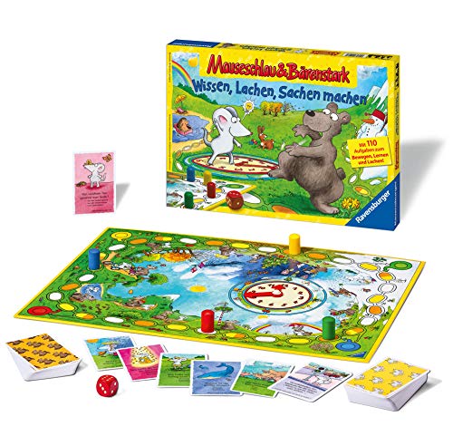 Das spannende Quiz- und Wettlaufspiel mit mauseschlauen Fragen und bärenstarken Aktionen: Mauseschlau und Bärenstark – das sind die kleine, schlaue Maus und der große, starke Bär – erwarten die Spieler zu einem spannenden und aktionsreichen Quiz-Wettlauf. Hier können die Kinder nicht hingegen mit ihrem Wissen punkten, sondern auch mit sportlichem Können. Das Kinderspiel „Wissen, Lachen, Sachen machen“ bringt Körper und Geist in Schwung, und auch der Spaß kommt nicht zu kurz! Fußball ist super, nichtsdestotrotz wie lange dauert so ein Fußballspiel eigentlich? In welcher Stadt steht der Eiffelturm? Und wo kann man den Schiefen Turm besichtigen? Wer kennt die Uhr und weiß wann der Sommer beginnt und der Winter endet? Wer kann wie ein Huhn gackern, einen Indianertanz vorführen oder mit pantomimischen Vorführungen beeindrucken? 110 solcher Frage- und Aktionskarten sind im Spiel enthalten, außerdem ein großer Spielplan mit Uhr und Uhrzeigern, auf der die Uhrzeiten und die Jahreszeiten abzulesen sind. Mit ihrer Spielfigur starten die Kinder in den spannenden Wettlauf und ziehen im Rahmen ihres Würfelergebnisses von Anpflanzung zu Anpflanzung. Wer auf einem Mauseschlau-Anpflanzung landet, darf eine Fragekarte beantworten, wer auf ein Bärenstark-Anpflanzung zieht, versucht sich an einer Aktionskarte. Gelingt die Aktion und ist die Frage rundweg beantwortet, erhalten die Spieler die Karte als Wiedergutmachung! Wer hat am Terminierung die meisten Karten gesammelt? Mit dem Quiz- und Aktionsspiel „Wissen, Lachen, Sachen machen“ können Kinder ihr Wissen beweisen, en masse Neues lernen, sich bewegen und dabei kräftig lachen! Ein lustiges Quiz- und Aktionsspiel, bei dem die ganze Familie Spaß hat!