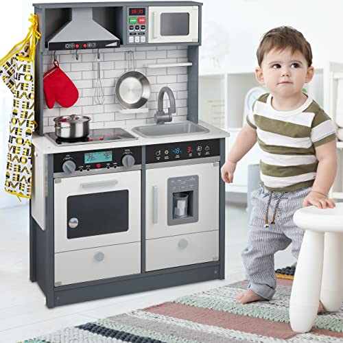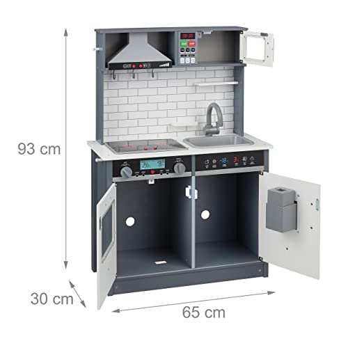 Relaxdays Spielküche für Kinder, mit Herd, Ofen & Spüle, HBT: 93 x 65 x 30 cm, Kinderküche mit Licht & Sound, grau/weiß