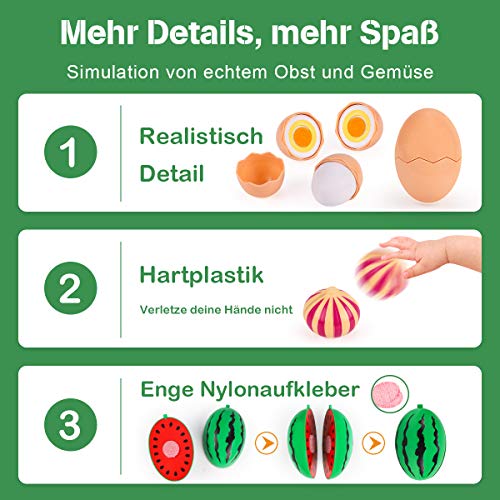 【Verschiedene Spiele】Kinder können nochmals Gemüse und Obst sicheln, und der Klick-Sound sorgt für ein realistisches Spielerlebnis. Verschiedene Töpfe und Utensilien können das Kochen nachahmen und das Essen letztendlich auf den Teller legen, was die Fantasie der Kinder anregt. Der Korb kann Dinge resorbieren und Formsortierspiele können gespielt werden. Umsetzen Sie die Feinmotorik Ihrer Kinder.