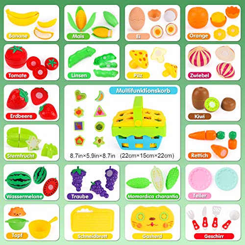 【Küchenspielzeug Set】Dieses Küchenspielzeug enthält eine Vielfältigkeit von Gemüse und Früchten (Tomaten, Mais, Eier, Erbsen, Pilze, Zwiebeln, Karotten, bittere Kürbisse, Bananen, Orangen, Erdbeeren, Wassermelonen, Trauben usw.), verschiedene Küchenutensilien, Schneidebretter, Kessel und Aufbewahrungskorb.