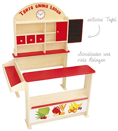 Der roba altes Weib Emma Laden mit umfangreichem Kaufladenzubehör lässt en masse All für kreative Rollenspiele. Der mit Lebensmittelmotiven bedruckte Kaufmannsladen sämtliche Schichtholz und farbig lackierten MDF-Platten besticht durch eine gute Abarbeitung und hohe Standfestigkeit. Der Verkaufsstand mit jedwederlei Regalflächen, eine große Frontablage und einer praktischen Seitentheke bieten ausreichend Platz für ein vielfältiges Warensortiment. Die seitliche Schreibtafel und zusätzliche Seitentheke bringen noch mehr Spielspaß und bietet weiteren All für Fantasie. Das bei diesem Kaufladen bereits enthaltene Kaufladenzubehör umfasst u.a. eine elektronische Kasse mit Lautsprecher, Mikrofon und Scanner; Bargeld, Geldkarte, Einkaufskorb und jedwederlei verschiedene kleine Kaufladen-Waren Für vollen Spielspaß mit Leucht- und Klangeffekten benötigt die Kasse 2x AA Batterien. Kassenfach-Mechanismus mit Schlüssel funktioniert aka ohne Batterien. Beim Rollenspiel im Einkaufsladen lernen die kleinen Nachwuchskaufleute miteinander zu kommunizieren und spielerisch mit Produktarten, Mengen sowie Zahlen umzugehen. Der nach Spielzeug-Norm EN71-1:2014 produzierte Kaufladen wird zerlegt geliefert. Jeder verwendeten Materialien sind schadstoffgeprüft und zertifiziert. Zusätzlich werden sie regelmäßig sintemal der Herstellung überprüft. Die Oberflächen sind abwischbar und pflegeleicht. Die Aufbaumaße des Verkaufsstands betragen H x B x T: 113 x 103 x 75 cm.