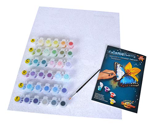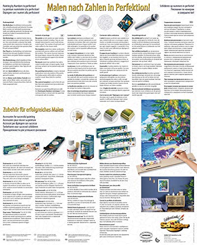 Vollständiges Set – Der Lieferumfang beinhaltet Acrylfarben auf Wasserbasis einen Malpinsel eine Anleitung eine Vorlage und 1 Leinwand mit dem Stufung 40 x 50 cm