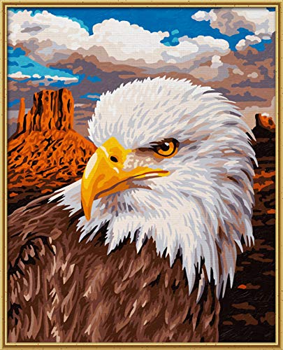 Die Luft ist sein bester Freund! Der Weißkopfadler, Wappenvogel der USA, ist mit seiner Länge von 90 cm und einer Flügelspannweite von 2,5 m der größte Greifvogel der Welt. Das kleine Gemälde im Format 24 x 30 cm soll daran erinnern, dass bekannt als der Weißkopfadler zu den gefährdeten Tierarten gehört und bereits seit 1940 strengen Artenschutz genießt. Ansprechende, detailgetreue Tierportraits für Kinder und Erwachsene in neuer Verkaufsverpackung. Da macht das Malen holistisch Spaß! Die Malen-nach-Zahlen-Technik sorgt für perfektes Gelingen und die richtigen Farbtöne der Malfarben auf Wasserbasis sind fertig vorgemischt. Die Malvorlage hat eine fühl- und sichtbare Leinenstruktur. Sie verbessert die Optik des fertigen Gemäldes und unterstreicht somit den malerischen Zeichen des Bildes mit dem gewünschten Öl-auf-Leinwand-Effekt.