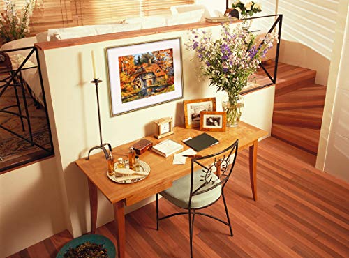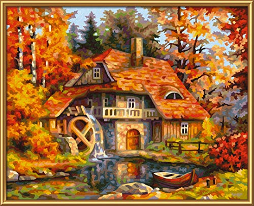Durch die tiefstehende Sonne erstrahlt die alte Tretmühle in den warmen Farben des Herbstes. Die leuchtend goldgelben und rotbraunen Blätter der Laubbäume spiegeln sich im vorbeifließenden Bach. Das vom Wasser angetriebene Mühlrad und der kleine Kahn am Ufer des Bachs Nachdruck verleihen die stimmungsvolle Komposition des Bildes. Es vermittelt Ruhe und Geborgenheit und regt zum Träumen an – als wenn die Zeit stehen geblieben wäre.