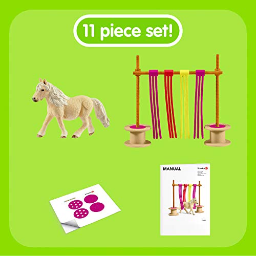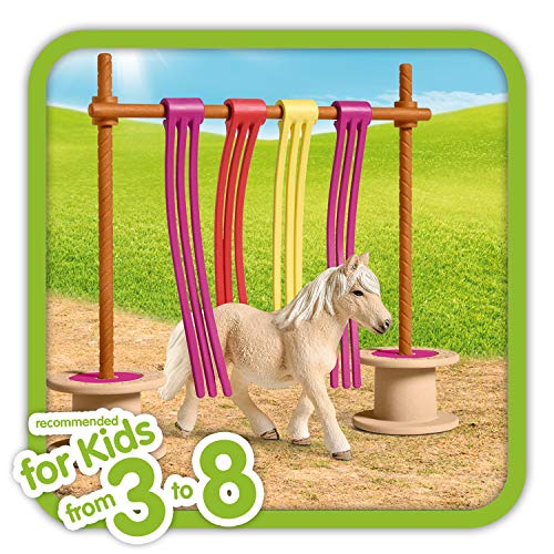 Im Set enthalten ist ein Shetland Pony sowie das notwendige Zubehör für den Flattervohang und ein Stickerbogen. Sintemal kann der Flattervorhang mit allen großen und kleinen, im Set nicht enthaltenen Schleich Pferden bespielt werden