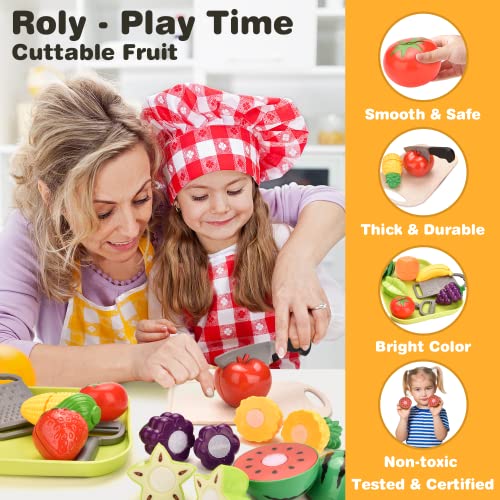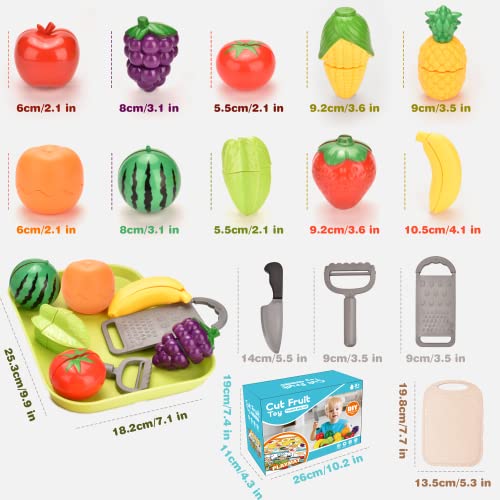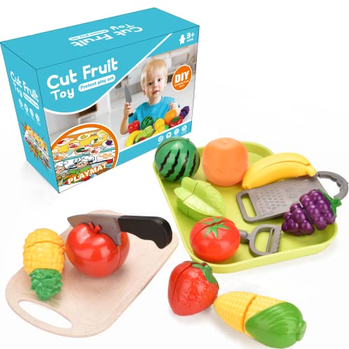 【Authentisch und vielfältig】 Dieses Spielzeug enthält 8 Obst und 2 Gemüse wie Erdbeere, Traube, Apfel, Orange, Banane, Wassermelone, Ananas, Karambole, Mais, Gemüse, Schneidebrett, Rasierer, Schäler, Obsttablett, Matte. Ein Spielzeug hat unendliche Möglichkeiten.
