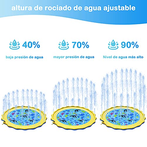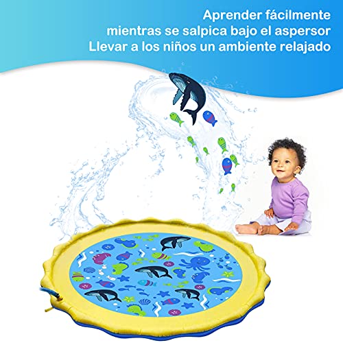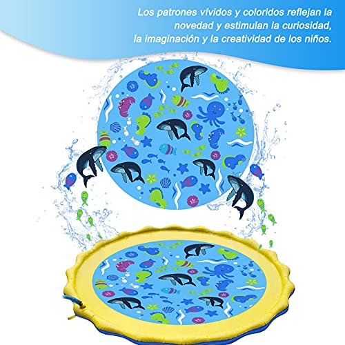 【Verbesserte Sprühkanten】 – Die Dicke des Randes des Wassersprühpads. Und das Loch ist gleichmäßig, was hilft, Wasserdruck standzuhalten und verhindert, dass es während des Gebrauchs bricht. Die Matte ist mit bunten Meeresfiguren verziert, die Ihnen im Sommer glückliche Wasseraktivitäten bereiten.