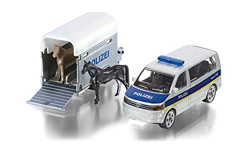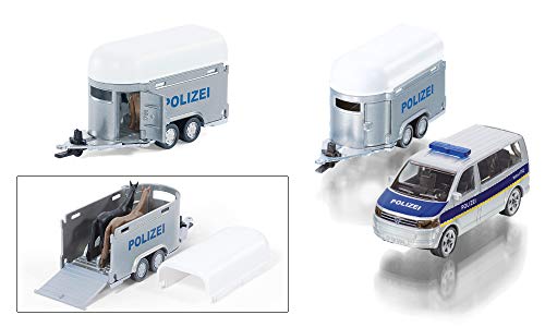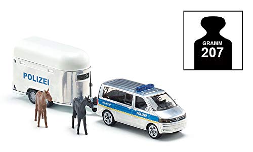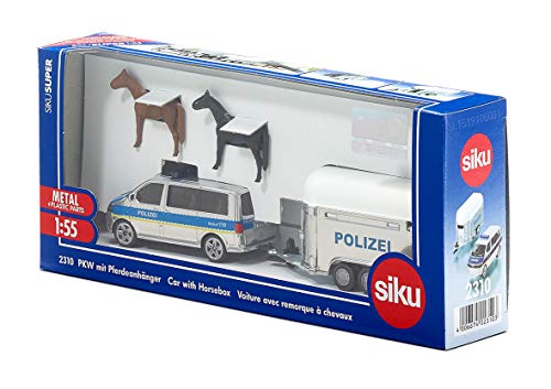 Detailliertes Spielzeugmodell eines Polizei-Transporter mit Pferdeanhänger und 2 dazugehörigen Spielzeug-Pferden zum Spielen und Sammeln – Umfangreiche Funktionen: Öffenbare Heckklappe und Rampe, Abkoppelbarer Adept, Allerbest gute Rolleigenschaften durch Bereifung leer Gummi – Langanhaltender Spielspaß durch unzählige Kombinationsmöglichkeiten innerhalb der SIKU Spielwelt – Ideal denn Geschenk statt dessen kleine und große Polizei- und Pferde-Liebhaber entsprechend, Perfekte Anhang zu SIKU Spielwelten – Lieferumfang: 1x SIKU 2310 Polizei-PKW mit Pferdeanhänger, Maßstab: 1:55, Material: Metall/Kunststoff, Abmessungen: 20 x 3,6 x 4,7 cm, Gewicht: 0,135 kg, Farbe: Argentum/Breit, Abfolge: SIKU SUPER
