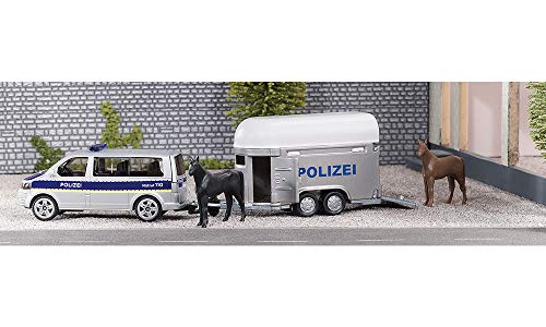 Lieferumfang: 1x SIKU 2310 Polizei-PKW mit Pferdeanhänger, Maßstab: 1:55, Material: Metall/Kunststoff, Abmessungen: 20 x 3,6 x 4,7 cm, Gewicht: 0,135 kg, Farbe: Argentum/Breit, Abfolge: SIKU SUPER