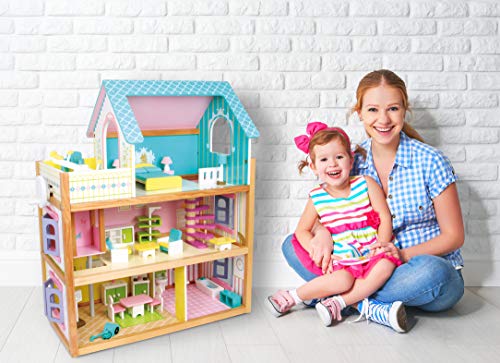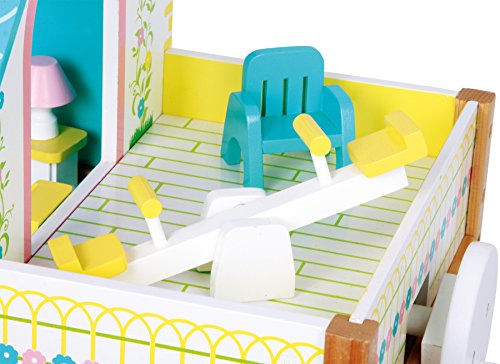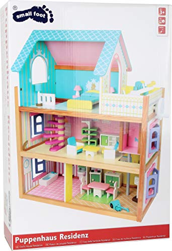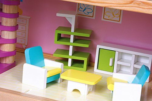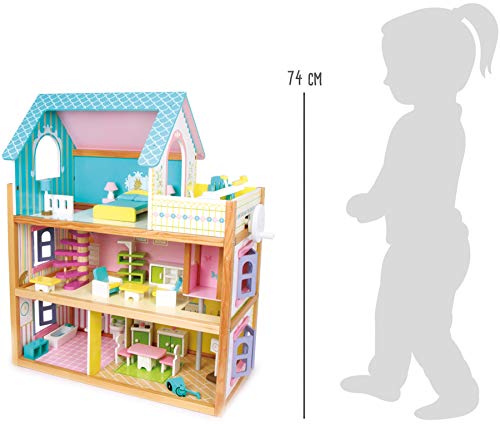 Hier ist die Fantasie zu Hause – dieses elegante Haus über seinen divergent gestalteten Wänden auch Böden ist ein Puppentraum in wunderschönen Pastellfarben! Vom Erdgeschoss in die erste Etage am Steuer sein die Bewohner über dem stufenlosen Fahrstuhl – Maschine über einer Handkurbel, auch weiter nach oben führt eine Wendeltreppe. Bunte Fensterflügel zum Öffnen sowie das 23-teilige Mobiliar garantieren stundenlange Spielzeiten über unseren Biegepüppchen.